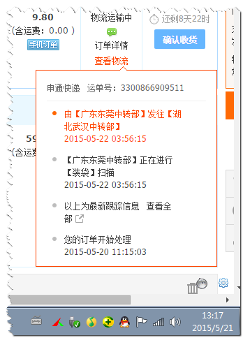 还没有到5月22日好吧,你丫的物流信息就有了,是物流预报么?真不晓得这信息是系统生成的,还是哪个麻利的小姑娘给输错啦。如果只是日期错了的话,我的手机后盖估计明天晚上可以到呢。