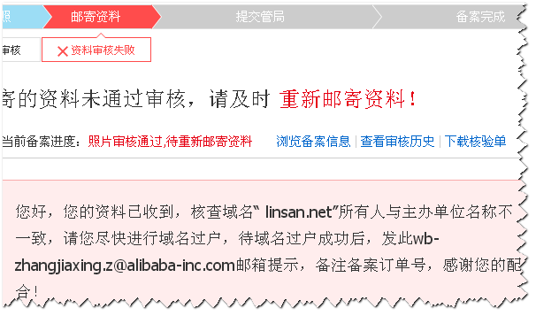 然后,第三天,我的EMS快递被接收。2天后信息被录入,告知域名所有人与主办单位名称不一致,不能备案云云(参见下图)。我就很差异,明明是我注册的域名,怎么不同啦,莫非注册商把域名所有人给偷偷换掉了么?我qq联系风云互联的值班,被告知信息全部都是我的,没问题。