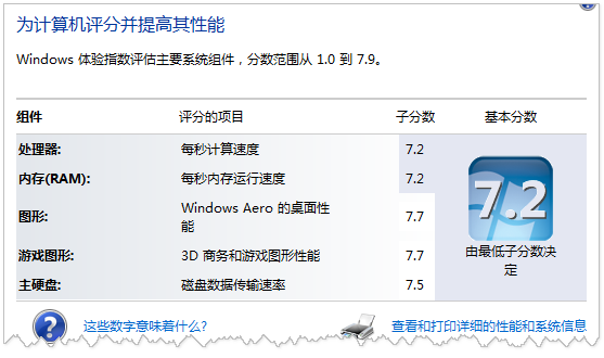 顺便说下最近对台式机的升级,购买独立显卡、固态硬盘后,安装好win7系统,目前体验指数飙升到7.2啦。系统优化后开机速度10秒,关机速度5秒。速度快的不要不要的,也因为仍然是i3-2120的cpu缘故,这个7.2是随了它的最低分,如果将来有机会将考虑这块的升级呢,有图有真相: