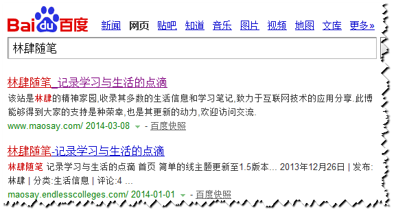 给域名续费的缘故,关注了下网站的关键字排名。虽然仍然是百度的首条,但是下面那条类似的搜索结果让我很厌烦。记得2011年我的林肆天空也是被采集了整站(也许是整站被盗),现在的林肆随笔,又是这样,每篇文章,包括评论都被别人偷了去,是针对性行为,还是无节操的网站漏洞?